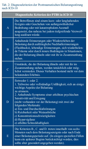 Die gewählten Kategorien stimmen in einigen Punkten mit den Diagnosekriterien für die posttraumatische Belastungsstörung (F43.1) aus dem ICD-10 überein (siehe Tabelle 2).