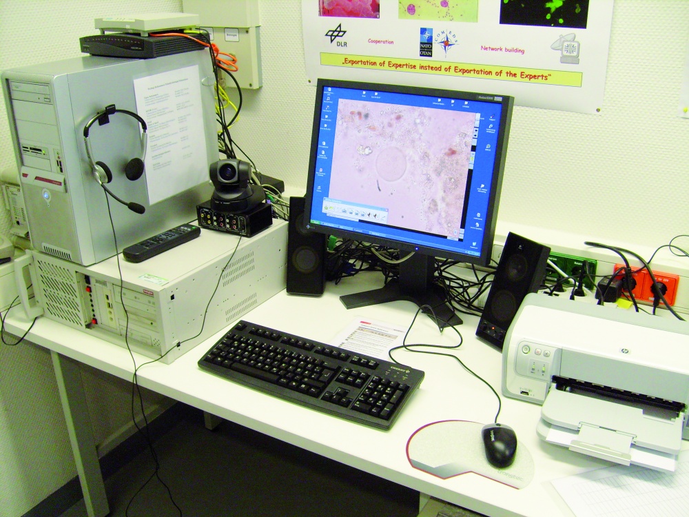 Um den diagnostischen Prozess in der Infektionsmedizin telemedizinisch zu unterstützen, wurde ein Peripheriemodul „Telemikrobiologie“ mit spezieller Geräte-, Kamera- und Softwareausstattung als Modifikation des standardmäßig verwendeten telemedizinischen Arbeitsplatzes (TA) entwickelt, konfektioniert und validiert [5]. Mittels dieser Anwendung, deren Kernelemente eine auf Mikroskop und Stereolupe konnektierbare Kamera sowie eine Spezialsoftware für Bildkommunikation, -archivierung, -übertragung und -auswertung sind, kann die Fach-expertise der Experten im ZInstSanDstBw Koblenz für die Einsätze verfügbar gemacht werden. Die telemedizinische Einbeziehung des Experten verbessert die diagnostische Spezifität durch Vermeidung falsch-positiver Befunde und erlaubt ohne vorherigen Probenversand nach Deutschland therapieentscheidende Diagnosestellungen, vor allem in der medizinischen Parasitologie [6]. Somit kann den besonderen epidemischen und endemischen Risiken (z. B. Malaria, intestinale Parasitosen und vieles mehr) in den Einsatzgebieten zeitnah und effizient im Sinne von Labor-gestützter „near real time surveillance“ begegnet werden. Es ermöglicht die sekundenschnelle Übertragung qualitativ hochwertiger Bilder von mikroskopischen Präparaten (Medizinische Parasitologie und Bakteriologie) oder von bewachsenen Nährmedien (Bakteriologie). Die Steuerung des diagnostischen Prozesses durch die Expertenstelle wird auch dann möglich, wenn im mikrobiologischen Einsatzlabor vor Ort ausschließlich medizinisch-technisches Assistenzpersonal eingesetzt ist. Das System kann in den Einsatzlaboratorien somit in der „primary opinion“- oder „secondary opinion“-Ver-sion betrieben werden [7].