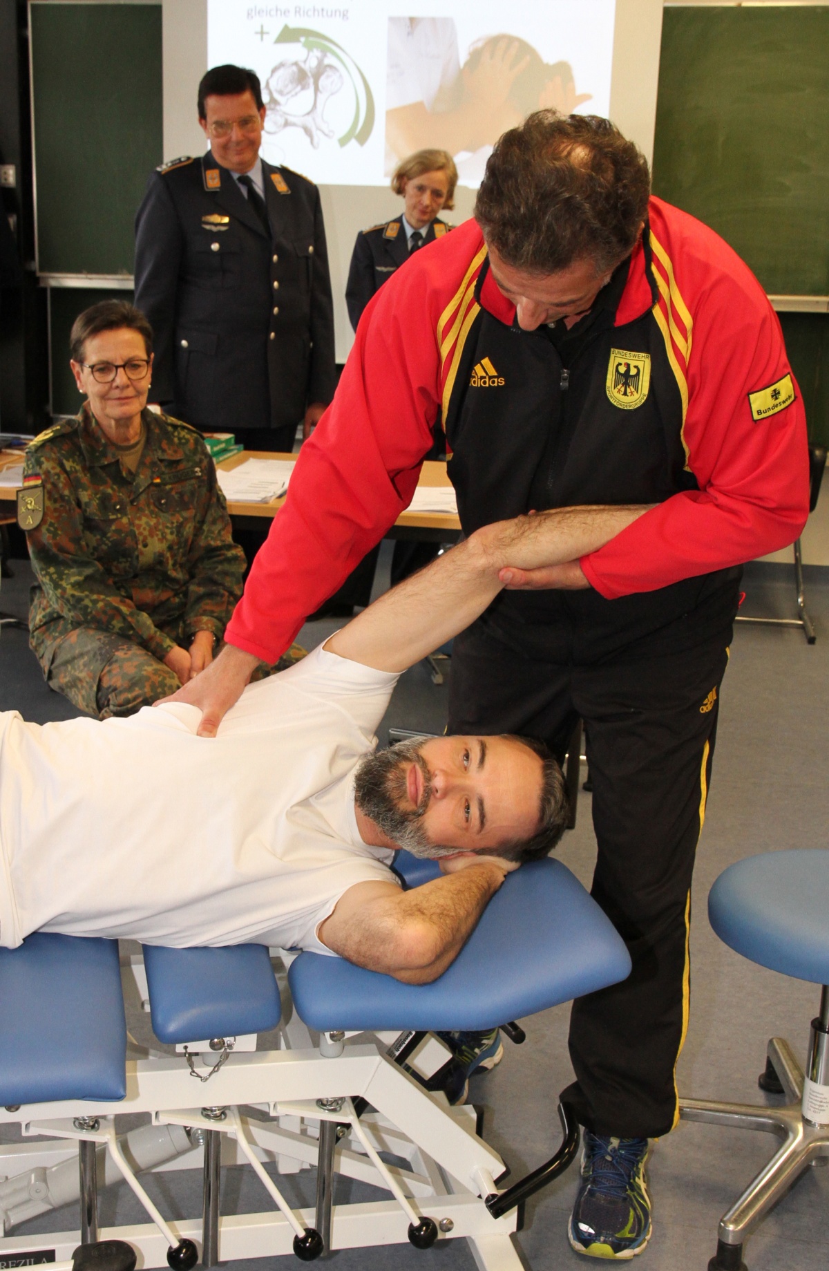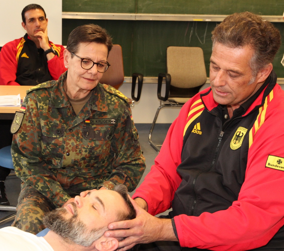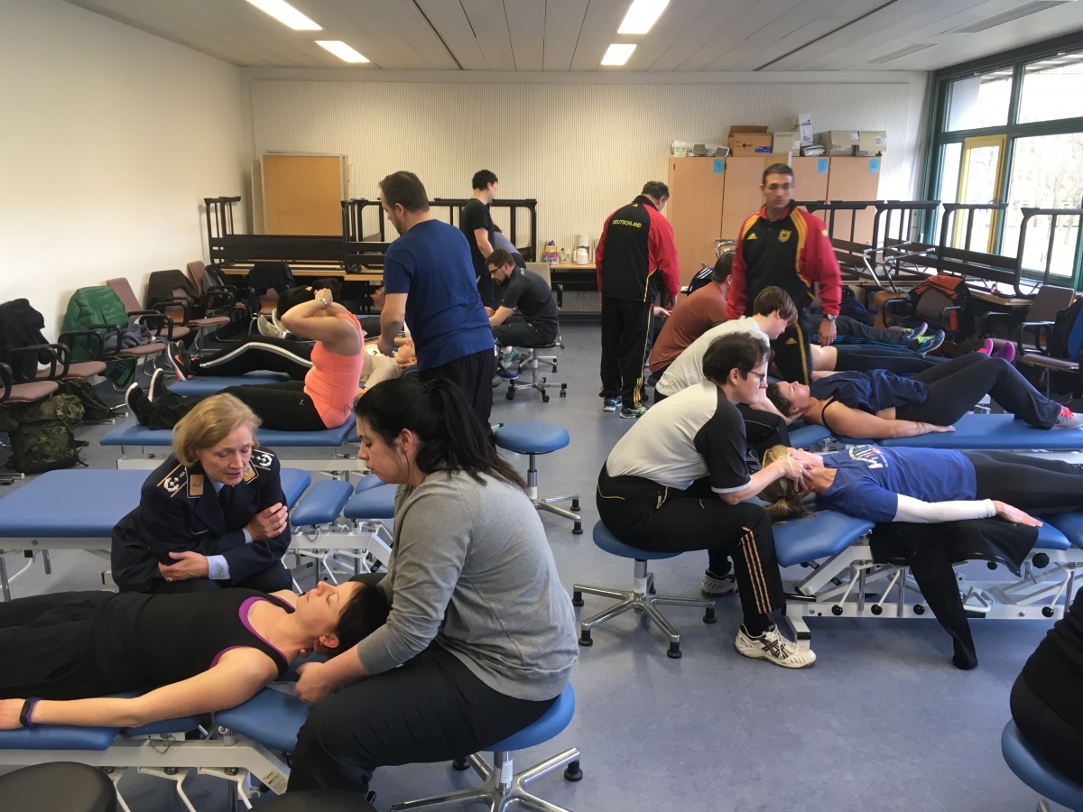 Nach Evaluation und Neustrukturierung ist einer der über Jahre erfolgreichsten Lehrgänge im Sanitätsdienst der Bundeswehr im Januar 2018 wieder aufgenommen worden: Das Training „Manuelle Medizin / Chirotherapie“. Die Kommandeurin der Sanitätsakademie der Bundeswehr, Frau Generalstabsarzt Dr. Gesine Krüger, wies bei ihrem Dienstaufsichtsbesuch im Grundkursus am 17. Januar 2018 auf die besondere wehrmedizinische Bedeutung dieser Disziplin hin und zeigte sich hoch erfreut, dass die gemeinsamen Anstrengungen von Kommando Sanitätsdienst, Kommando Regionale Sanitätsunterstützung,