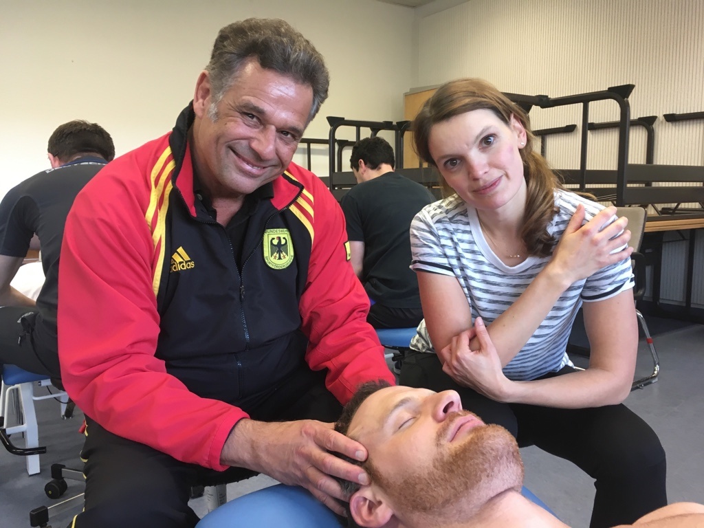 Die Lehrgangsteilnehmerinnen und –teilnehmer erlernen u. a. Griffe zur Lösung cervicothorakaler Blockierungen, wie den „Intercostal Slinger“, oder den berühmten „Suboccipital Release“, eine Therapietechnik zur Entspannung von Faszien und Muskeln der Kopf-Nackenregion. Mit dem „Temporal Release“ Griff lassen sich cervicale temporale Kopfschmerzen gut behandeln und zusätzlich Hirnareale aktivieren, die für Konzentration und Aufmerksamkeit eine wichtige Rolle spielen. Bei funktionellen Cervicothorakalsyndromen mit cervicobrachialgiformer Schmerzausstrahlung, lokalen oberen Thorakalsyndromen kann zudem die obere BWS mit dem „modifizierten Doppelnelson“ Griff erfolgreich therapiert werden.