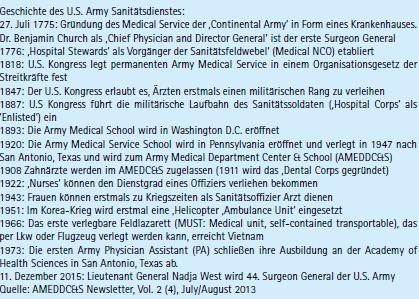 1775 gilt als die Geburtsstunde des Sanitätsdienstes der U.S. Army. Die ‚Army Medicine‘ hat sich in seiner über 240-jährigen Geschichte zu dem größten und leistungsstärksten Sanitätsdienst der amerikanischen Streitkräfte entwickelt. Ein Sanitätsdienst, der gerade zu Kriegszeiten stets in hohem Maße gefordert wurde und sich dabei immer durch die neuen Herausforderungen der jeweiligen Konflikte konsequent weiterentwickelt hat.
