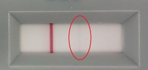 Zum Einsatz kamen Testsysteme des Typs miPROTECT® der Firma miprolab. Der Test wurde jeweils als Dreifachbestimmung durchgeführt. Bei diesem System muss für ein gültiges Ergebnis die Kontrolllinie C deutlich erkennbar sein. Ist die Testlinie T ebenfalls erkennbar, so gilt der Test als positiv (Abbildung 2 und 3). Alle Tests wurden nach 5 bzw. 20 Minuten Inkubationszeit (Herstellerangabe) abgelesen, visuell ausgewertet und per Foto dokumentiert.