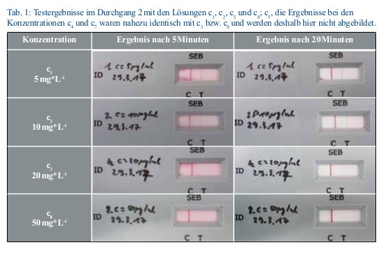 Der erste Durchgang wurde durchgeführt, um den Detektionsbereich grob eingrenzen zu können. Nach Herstellerangabe musste angenommen werden, oberhalb einer SEB-Konzentration von 500 µg*l-1 keine positiven Ergebnisse mehr zu finden. Aufgrund dieser Annahme wurden die Konzentrationen der Verdünnungsreihe im ersten Durchgang zu niedrig gewählt. Unterhalb von 500 µg*l-1 zeigte kein Test ein positives Ergebnis. Die LDL wurde vom Hersteller auf erneute Anfrage mit 10 µg*l-1 angegeben. Wir hatten allerdings als nächste Verdünnungsstufe unterhalb von 500 µg*l-1 nur eine Konzentration von 1 µg*l-1 gewählt und deshalb kein positives Ergebnis mehr erhalten. Damit stehen unsere Ergebnisse in Übereinklang mit den Herstellerangaben.