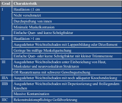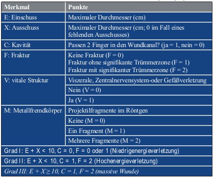 Eine Klassifikation, die die Schusswunde fokussiert und es gleichzeitig auch jedem Behandler ohne komplexe Diagnostik erlaubt, die Wunde einzuteilen, ist die „Red Cross classification of war wounds“ von Coupland (Tabelle 1; [28]). KOBBE et al. [1] teilten resultierende Weichteilschäden und Frakturen nach Extremitätenbeschuss ebenfalls am Kriterium der Niedrigenergie/Hochenergiegeschosse ein und orientierten sich bezüglich der Frakturen an der, in der Unfallchirurgie weit verbreiteten, Gustilo-Anderson-Klassifikation (Tabelle 2; [29]). So können durch Niedrigenergiegeschosse erzeugte Frakturen dem Typ I oder Typ II und durch Hochenergiegeschosse erzeugte Frakturen dem Typ III nach Gustilo-Anderson zugeordnet werden.