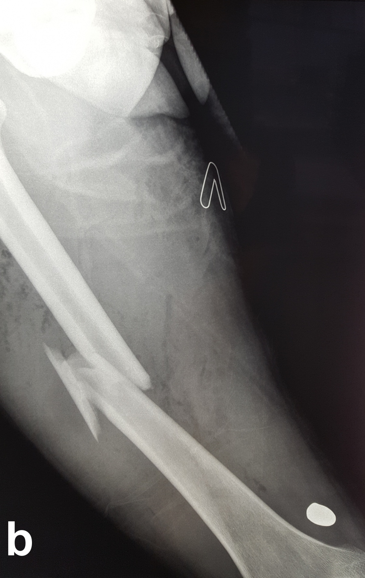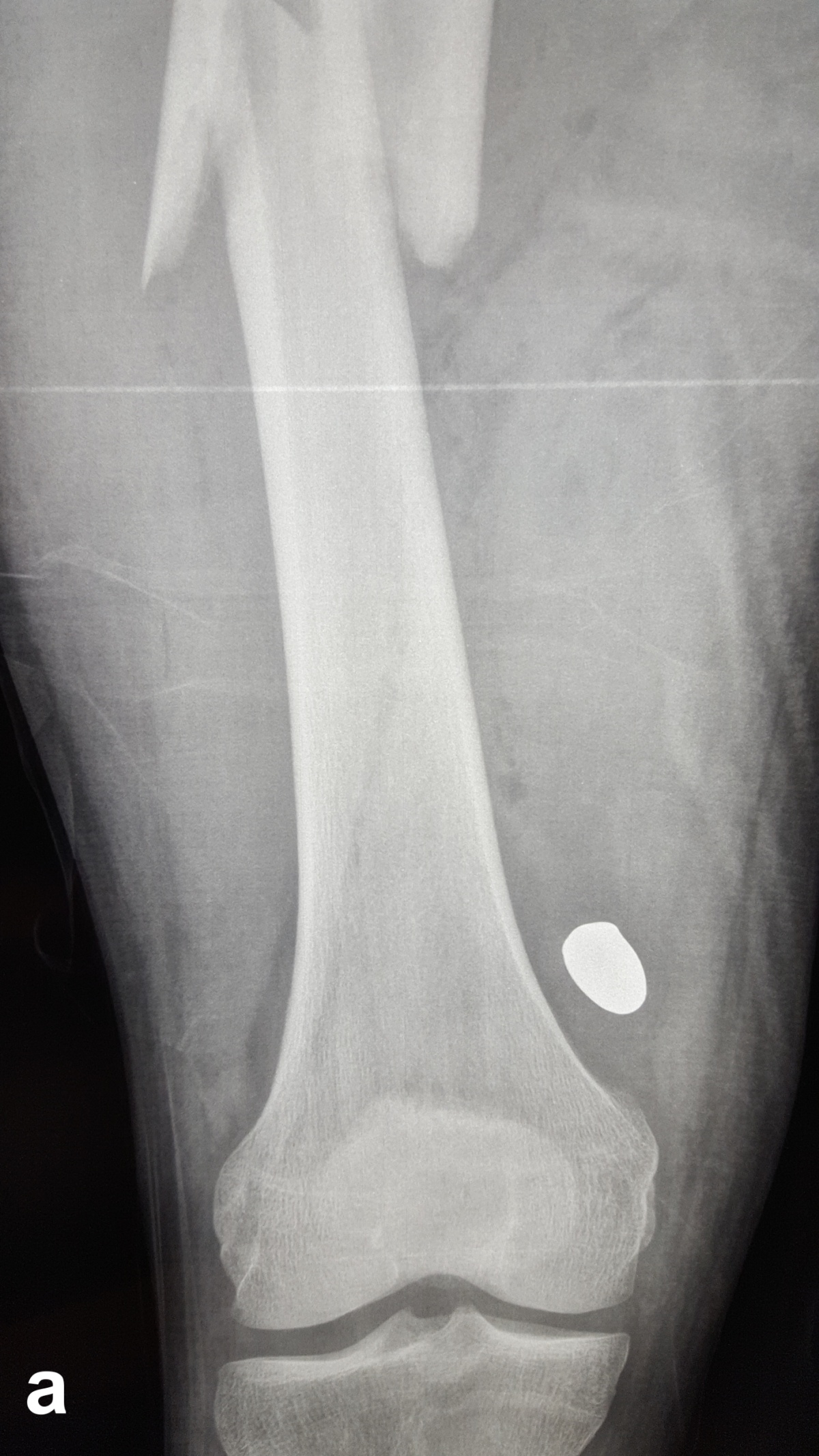 der Schussfraktur des rechten Femurs zudem das noch oberhalb des Kniegelenks befindliche Projektil.