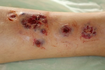 Nur zwei Tage nach der Verlegung zeigte sich eine Exazerbation des Hautbefundes (Abbildung 2). Trotz oben genannter Therapie waren die Knoten deutlich größenprogredient mit Ulzerationen; zusätzlich fielen neue livide Papeln auf, die im weiteren klinischen Verlauf ebenso ulzerierten. Bei negativen bakteriologischen Abstrichen und Grampräparat gingen wir nun von einem Pyoderma gangraenosum aus. Wir änderten die Lokaltherapie auf ein lokales Steroid der Klasse IV und atraumatische Wundverbände mit täglichen Verbandwechseln. Die antibiotische Systemtherapie wurde abgesetzt.