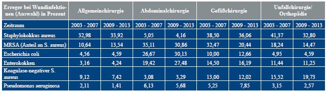 Bezogen auf das beschriebene Keimspektrum zeigt die Prävalenzstudie Deutschland 2011 zur Antibiotikaresistenzlage für Methicillin-/Oxacillin-resistente Keime (Vier-Jahres-Antibiotika-Resistenz-Surveillance (ARS)) auf, dass in den Vergleichsjahren 2009 und 2012 sowohl in der allgemeinen stationären Versorgung (24,2 % auf 21,3 %) als auch auf Intensivstationen (26,7 % auf 21,7 %) der Anteil an MRSA bezogen auf den Gesamtnachweis von S. aureus abgenommen hat. Einschränkend muss jedoch festgestellt werden, dass die Vier-Jahres-ARS nicht allein die Wundinfektion wiedergibt, sondern auch andere Infektionen (z. B. Nachweis in Blutkulturen) inkludiert [12]. Entgegen dem abnehmenden Trend von MRSA-Infektionen nimmt der Anteil Vancomycin-resistenter Enterokokken (VRE) an nosokomialen Infektionen stetig zu. Überdies hinaus hat sich die Verteilung von E. faecalis zu E. faecium in den letzten 10 Jahren verschoben. E. faecium wiederum macht nunmehr den größten Anteil der VRE aus (8 – 15 %), E. faecalis lediglich <1 % [19, 20, 22].