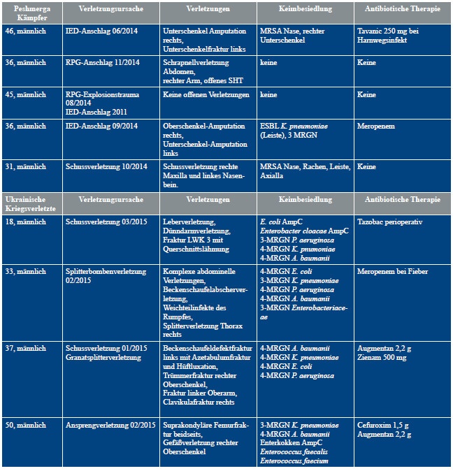 In diese Arbeit sind die Ergebnisse einer PubMed-Recherche zu den Suchbegriffen „MRSA“, „VRE“, „ESBL“, „MRGN“, „Antibiotikaresistenz“, „Epidemiologie“, „KISS“, „KRINKO“ aus Deutschland unter besonderer Beachtung des sich wandelnden Keimspektrums in den letzten zehn Jahren sowie unsere Erfahrungen aus der komplexen Behandlung kriegsverletzter kurdischer Peshmerga-Kämpfer aus Syrien und dem Irak sowie Patienten aus der Ukraine, die in den letzten Jahren im BwKrhs Ulm versorgt wurden, eingeflossen. Hier erfolgte ein Screening auf sämtliche multiresistenten Erreger von den empfohlenen Stellen (neben Wunden Rektum, Urin, Mund-/Nasen-/Rachenraum, Respirationstrakt und großflächige Areale der Haut), dessen Ergebnis nach entsprechender Bebrütung einbezogen wurde. Darüber hinaus haben wir gezielt die Empfehlungen und Datenbanken des Robert-Koch-Instituts, der Paul-Ehrlich-Gesellschaft sowie des Nationalen Referenzzentrums für Surveillance von nosokomialen Infektionen im Hinblick auf die in Deutschland vorkommenden Keime bei Wunden analysiert.
