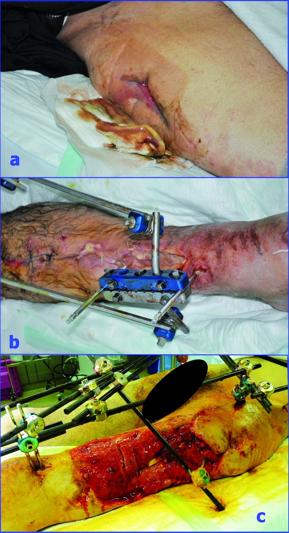 B.) infizierte Weichteilwunde mit anliegendem Fixateur externe nach Splitterverletzung am Unterschenkel