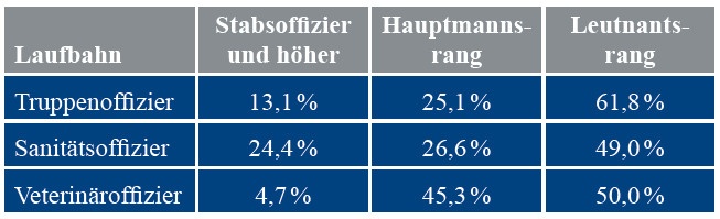 Höhere Dienstgrade fehlten im Vergleich zu den anderen Offizierlaufbahnen in erheblichem Umfange (Tabelle 1). 1913 waren von 728 Veterinäroffizieren der deutschen Armee nur 36, d. h. 4,94 %, in Stabsoffiziersrängen (ein Generalveterinär und 35 Korpsstabsveterinäre im Majorsrang). Der Dienstgrad Oberstleutnant fehlte bis Juli 1917 gänzlich (vergleiche Tabelle 2). Mit Erreichen der Stellung eines Regimentsveterinärs im Dienstrad Stabsveterinär war das allgemeine Laufbahnziel erreicht [7].