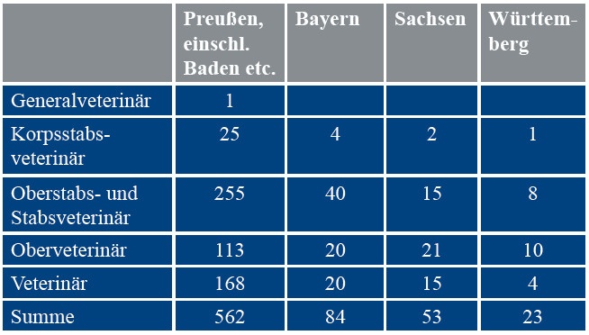 Das Deutsche Heer hatte zu Beginn des Krieges 766 aktive Veterinäroffiziere und einschließlich der Unterveterinäre 1 507 des Beurlaubtenstandes (Offiziere der Reserve). Insgesamt nahmen 5 354 Veterinäroffiziere, das waren rund 75 % der insgesamt etwa 7 200 deutschen Tierärzte, am Kriege teil. Davon starben, fielen oder erlagen ihren Kriegsverwundungen 241 Veterinäre und zwar 9 Korpsstabs- bzw. Generaloberveterinäre, 14 Oberstabsveterinäre, 67 Stabsveterinäre, 60 Oberveterinäre und 34 Unter-, Feldunter- und Feldhilfsveterinäre (Abbildung 2).