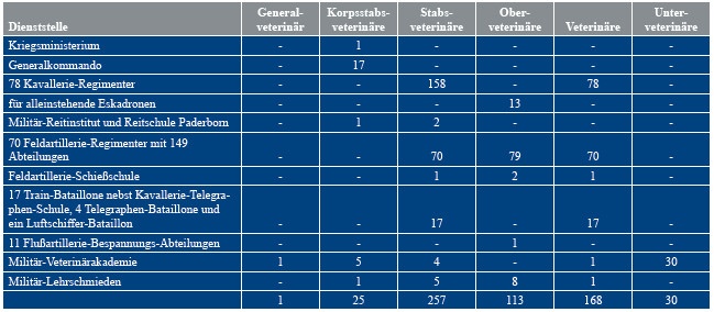 Kriegsdepartement im Kriegsministerium. Die Inspektion des Militärveterinärwesens wurde aber aufgelöst, die Militär-Veterinärakademie wurde verkleinert und die frei werdenden Offiziere, die an die Akademie kommandierten Offiziere und die Unterveterinäre wurden sofort zu ihren Stammtruppenteilen beordert. Studenten, die das fünfte Semester beendet hatten, wurden als Feldunterveterinäre zu den Armeekorps mit besonderem Veterinärbedarf befohlen [7]. Eine Übersicht über die Dienstposten bei den Dienststellen der Preußischen Armee gibt die Tabelle 3.