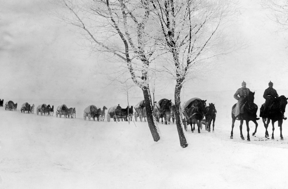 Besonders groß waren die physischen Anforderungen an die Truppe und damit an den Truppenveterinärdienst im Osten. Nicht nur der im Gegensatz zur Westfront lange dauernde Bewegungskrieg auf ausgefahrenen und grundlosen Wegen, denkbar schlechte und unhygienische Unterkünfte und nicht zuletzt der frühzeitig hereinbrechende russische Winter mit Märschen auf schneeverwehten oder eisglatten Wegen (Abbildung 3), zugefrorene Wasserstellen und Brunnen entkräfteten die Tiere rasch, so dass sie tierärztlich versorgt werden mussten [2]. Im Februar 1916 berichtete der Divisionskommandeur Otto von Moser im Raum Dünaburg, dem heutigen Daugavpils, in Lettland über den Ausbruch der Räude bei den Pferden in seiner Division und beschreibt: