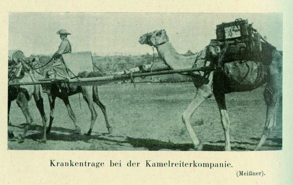 Kamele fanden besonders als Lastentiere in Kleinasien, Syrien, Mesopotamien und im Kaukasus Verwendung. Sie wurden aber auch als Reittiere und zum Krankentransport (Abbildungen 5 und 6) eingesetzt. Selbst Ochsengespanne fanden auf dem Balkan und im Osten daneben auch Büffelgespanne mit Erfolg Verwendung. Allerdings verhinderten Ausbrüche der Maul- und Klauenseuche mehrfach ihren Einsatz. In Afrika dienten Ochsen auch als Reittiere (Abbildung 7) [2].
