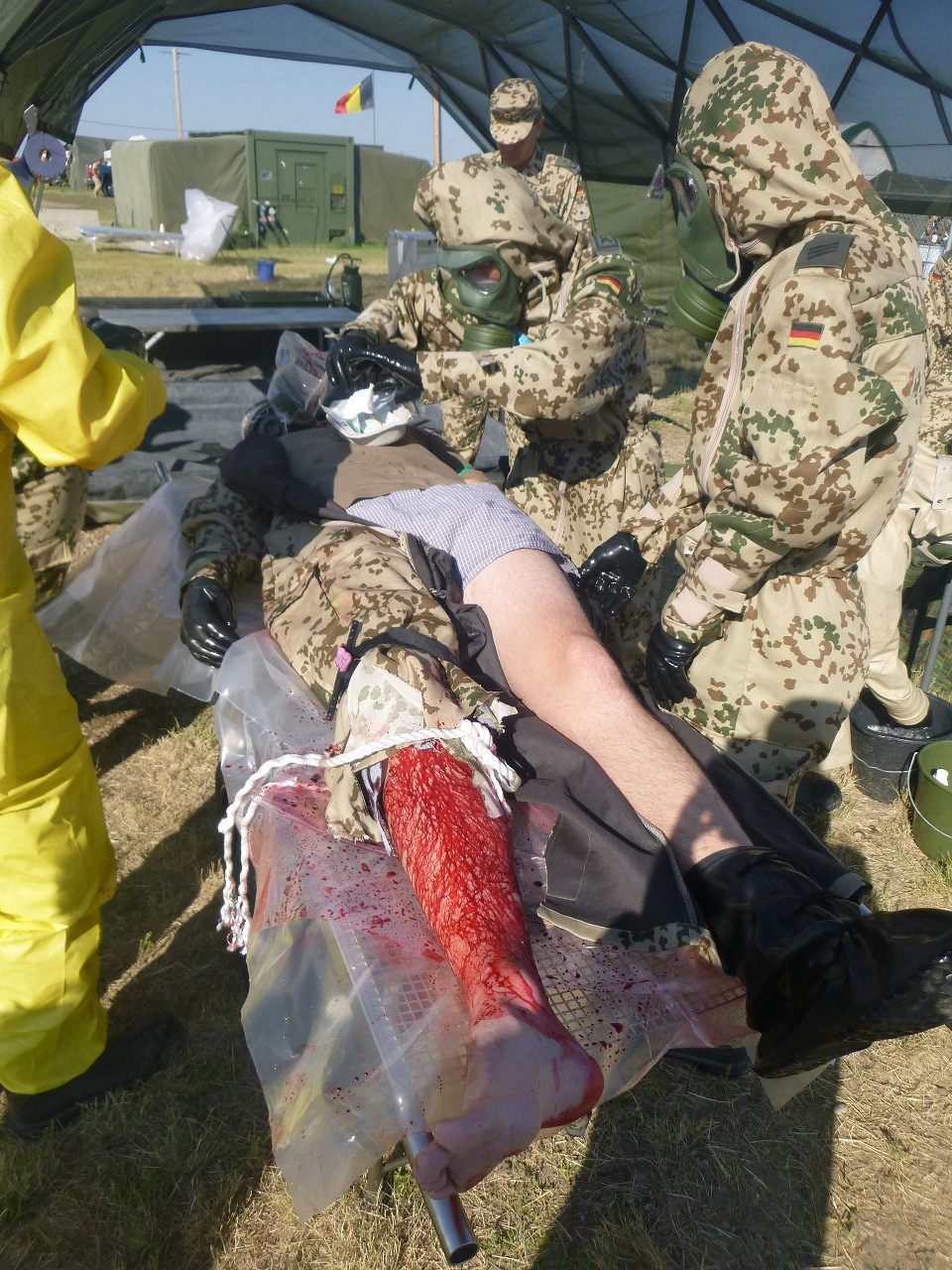 Aktuelle Bedrohungen, wie der Einsatz von Chemiewaffen bei Konflikten im Nahen Osten, aber auch die Vorbereitung auf Einsätze im Rahmen der Landes- und Bündnisverteidigung, stellen den Sanitätsdienst der Bundeswehr vor neue Herausforderungen. Dabei müssen betroffene Patienten auf allen Ebenen der Rettungskette rasch dekontaminiert und gleichzeitig notfallmedizinisch stabilisiert werden können, bevor sie weiter behandelt werden.