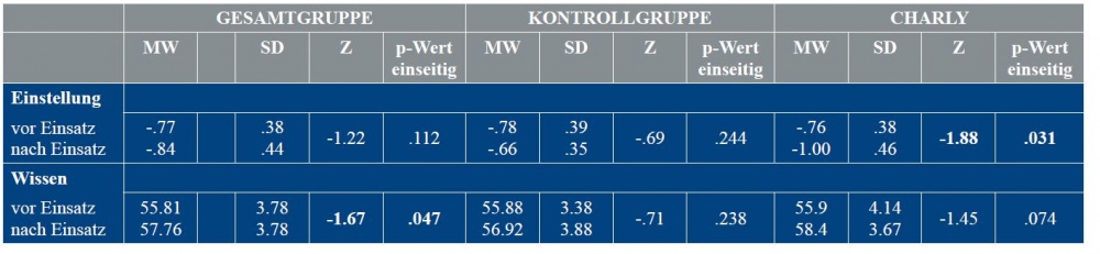 Mittels Wilcoxon-Rangsummen-Test für unverbundene Stichproben zeigte sich sechs Monate nach Einsatzende, dass die CHARLY-Gruppe signifikant (Z = 2,125; p = .017) weniger dogmatische Einstellungen hatte als die Vergleichsgruppe. Tabelle 1 zeigt die Ergebnisse der Wilcoxon-Vorzeichen–Rang-Tests für verbundene Stichproben über die beiden Messzeitpunkte.
