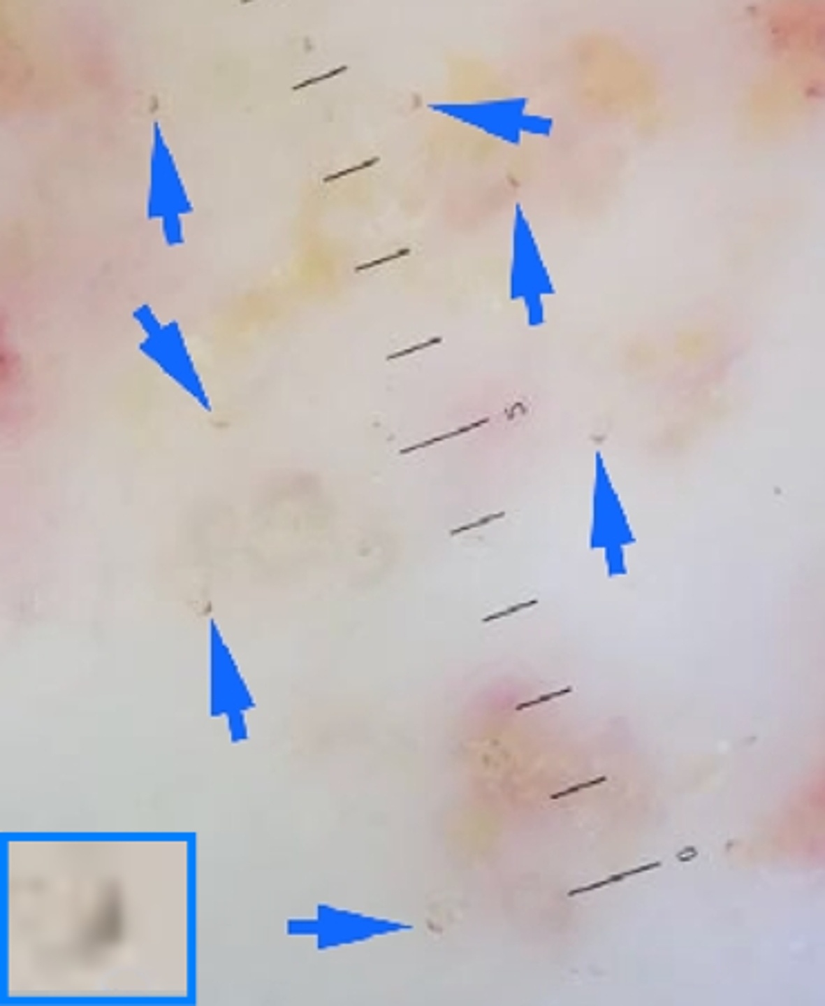 Abb. 2: Im auflichtmikroskopischen Bild der Haut imponieren zahlreiche Krätzmilben als reiecksförmige Gebilde; unten links vergrößerte Darstellung eines „Drachenfliegers“; die eingeblendete