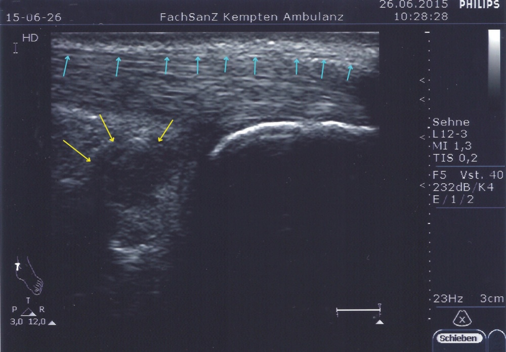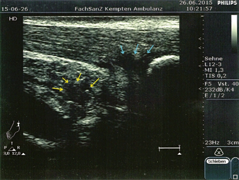 Im Rahmen der Diagnostik in der truppenärztlichen Sprechstunde kann neben der obligaten klinischen Untersuchung eine sonographische Darstellung beider Achillessehnen im Seitenvergleich erste Anhalte für die Ursache der Beschwerdesymptomatik liefern.