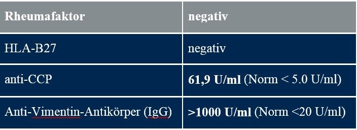 Im Februar 2015 erfolgte eine immunserologische Diagnostik im Labor des Bundeswehrzentralkrankenhauses (BwZKrhs) Koblenz zur Detektion einer differenzialdiagnostisch möglichen Erkrankung aus dem rheumatoiden Formenkreis (Tabelle 1). Zuvor konnte eine aktive oder abgelaufene Borreliose laborchemisch ausgeschlossen werden.