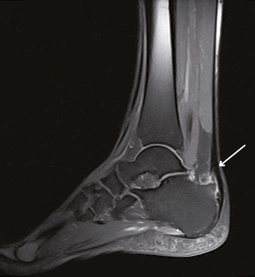 Ein einfacher Test zur Abgrenzung von einer Ruptur der Sehne mit Hämatom, Schwellung und eventuellem Tasten einer Delle ist nach wie vor der Simmonds-Thompson-Test (Plantarflexion des Fußes durch Kompression der Wadenmuskulatur bei intakter Achillessehne). Wie in der Kasuistik beschrieben, erfolgt die weitere Diagnostik mittels Sonographie der Ferse zur Darstellung einer Verdickung, Hypervaskularisation oder Zunahme von echoarmen Arealen. Zudem sollte eine Röntgenuntersuchung durchgeführt werden, um eine mögliche Haglund-Exostose zu detektieren. Eine Kernspintomographie der betroffenen Ferse eignet sich sehr gut zur Darstellung sowohl von strukturellen Veränderungen der Achillessehne, als auch begleitender Entzündungszeichen (siehe Abbildung 3).