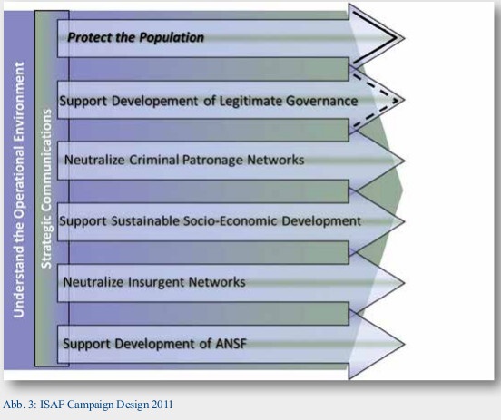 Zur Erreichung des politischen Zieles wurde ein strategischer Ansatz (campaign design) gewählt, der den Schutz der Bevölkerung als wichtigste Operationslinie, gleichwohl aber auch die Neutralisierung der Netzwerke der Insurgenten als auch der organisierten Kriminalität und nicht zuletzt den Wiederaufbau der AFG Sicherheitsorgane[8] als Aufgabe beschrieb (vergleiche Abbildung 3)[9].