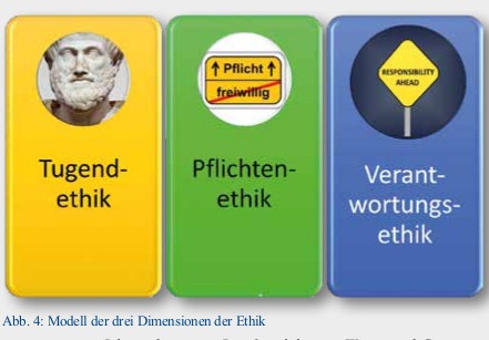 Wie im Folgenden noch gezeigt wird, ist es nicht zielführend, sich ausschließlich auf eine der drei Ethiken (Tugend-, Pflichten- oder Verantwortungsethik) zu begrenzen, was bisweilen vorgeschlagen wird [38: 116]. Dieses Vorgehen reduziert zwar den Aufwand der ethischen Abwägung, birgt aber die Gefahr einer Eindimensionalität, die dann auch zu einseitigen Bewertungen und Entscheidungen führt.