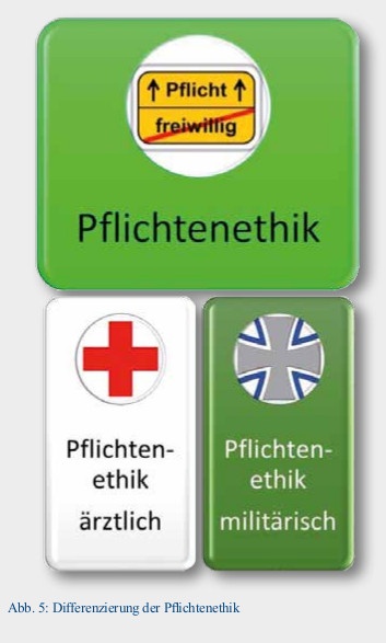 Der Name Pflichtenethik (oder auch deontologische Ethik) deutet an, dass hier kanonisierte, vom betroffenen Individuum übernommene Pflichten der Ausgangspunkt der Überlegungen sind. Die Pflichtenethik ist für den Sanitätsdienst aufgrund des Doppelberufs in eine medizinische und eine militärische Seite zu differenzieren (vergleiche Abbildung 5).