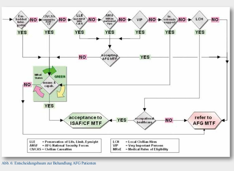 Neben den in Kapitel 6 dargestellten Beschreibungen der unterschiedlichen Patientenkollektive und deren Besonderheiten sind darin auch – in Form von Ablaufschemata – Verfahren der Entscheidungsfindung entwickelt. In Abbildung 6 ist das Grundschema des Entscheidungsbaumes dargestellt, das das Verfahren zur Prüfung der Behandlung afghanischer Patienten in Behandlungseinrichtungen der NATO/Coalition Force beschrieb.[23]