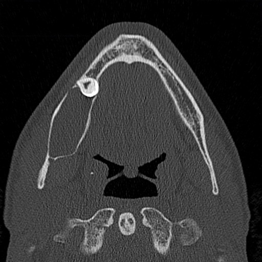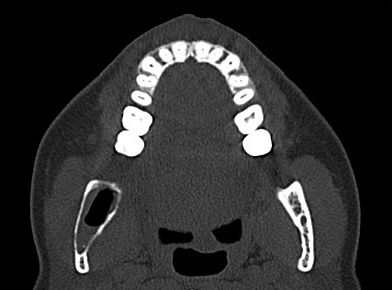 Die durch den zuweisenden Kollegen entnommene Probe erbrachte die Diagnose eines keratozystischen odontogenen Tumors. Die extraorale Untersuchung bei der stationären Aufnahme war unauffällig, der intraorale Befund ergab ein karies- und füllungsfreies Gebiss. Die ergänzend angefertigte Computertomographie des Unterkiefers zeigte eine von der Basis des Unterkiefercollums bis distal des Zahnes 44 reichende Zyste (Abbildungen 6 und 7).