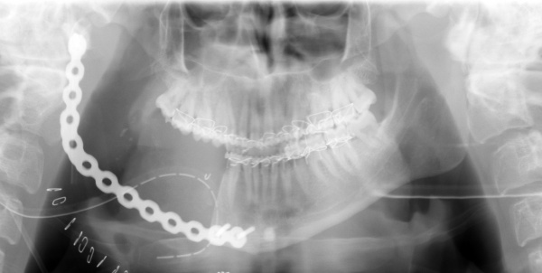 Wir führten zunächst eine Zystektomie in Intubationsnarkose unter Erhalt des N. alveolaris inferior durch. Die histologische Untersuchung ergab ein Ameloblastom. Daraufhin erfolgte eine Hemimandibulektomie rechts von extraoral mit Erhalt des rechten Unterkieferköpfchens und Überbrückung des Defektes mit einer Rekonstruktionsplatte. (Abbildung 4). Histologisch fanden sich intraossär und in der anteilig resezierten Mundschleimhaut weitere Ausläufer des Tumors. Die Resektionsränder waren tumorfrei.