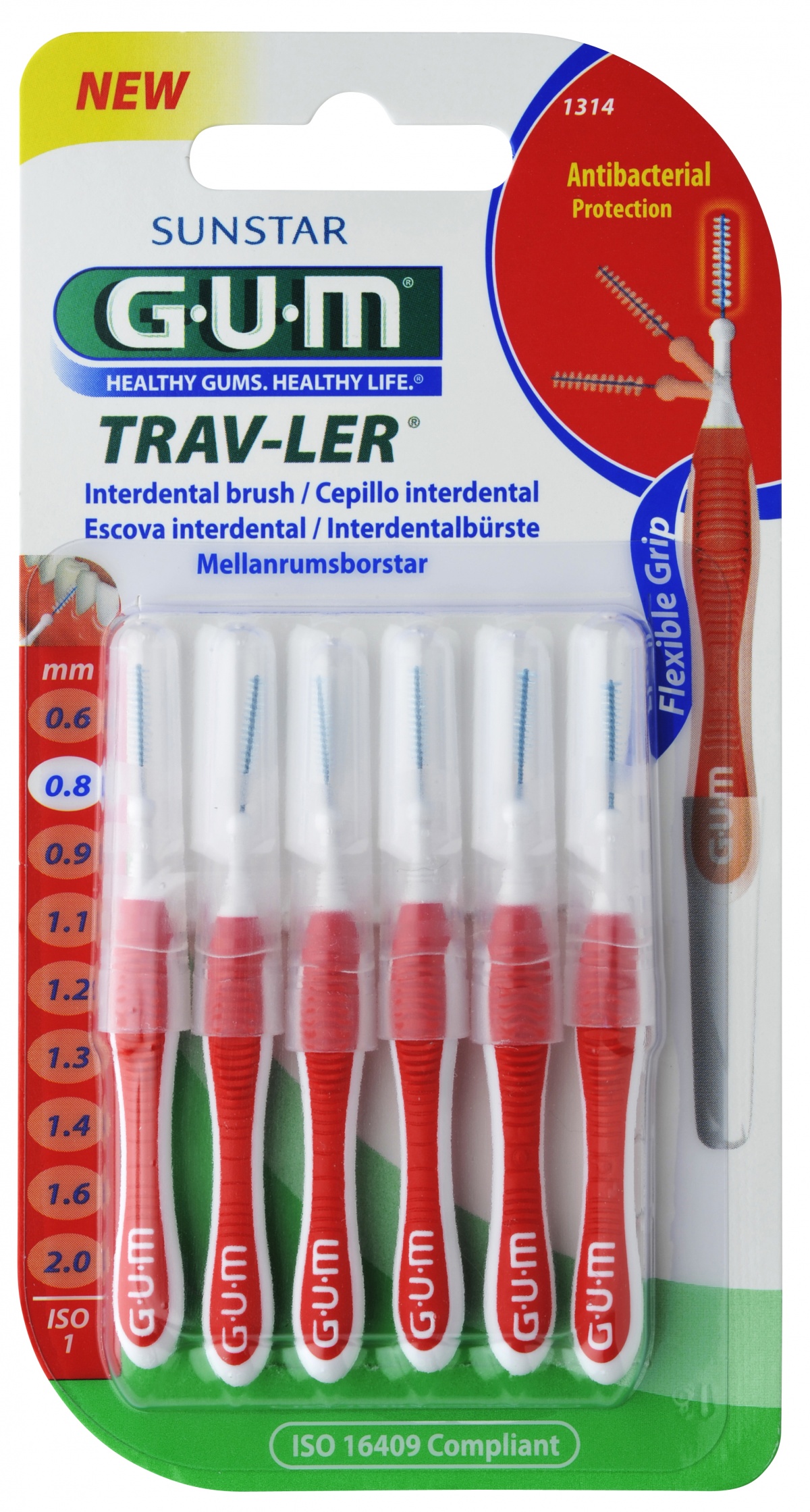 Patienten mit Kronen, Implantaten oder kieferorthopädischen Apparaturen benötigen „besondere“ Pflege für die vielen schwer erreichbaren Stellen im Mund. Interdentalbürsten mit ergonomischem Griff, flexiblem Bürstenkopf und antibakteriellen Filamenten erfüllen die nötigen Voraussetzungen. GUM® TRAV-LER® weist genau diese Eigenschaften auf: Der Griff ist flexibel, der Hals aus Kunststoff kann um bis 90 Grad gebogen werden, der Draht ist ummantelt und für antibakteriellen Schutz mit Chlorhexidin versehen. Die innovative Dreiecks-Borstenstruktur sorgt für eine deutlich verbesserte Plaque-Entfernung. Es stehen neun verschiedene Größen und zwei Formen (Kerze: Frontzähne, Tanne: Seiten- und Backenzähne) zur Verfügung, um die bestmögliche Patientencompliance zu gewährleisten.
