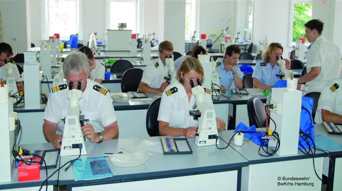 Sanitätsoffiziere üben die Parasitenmikroskopie während