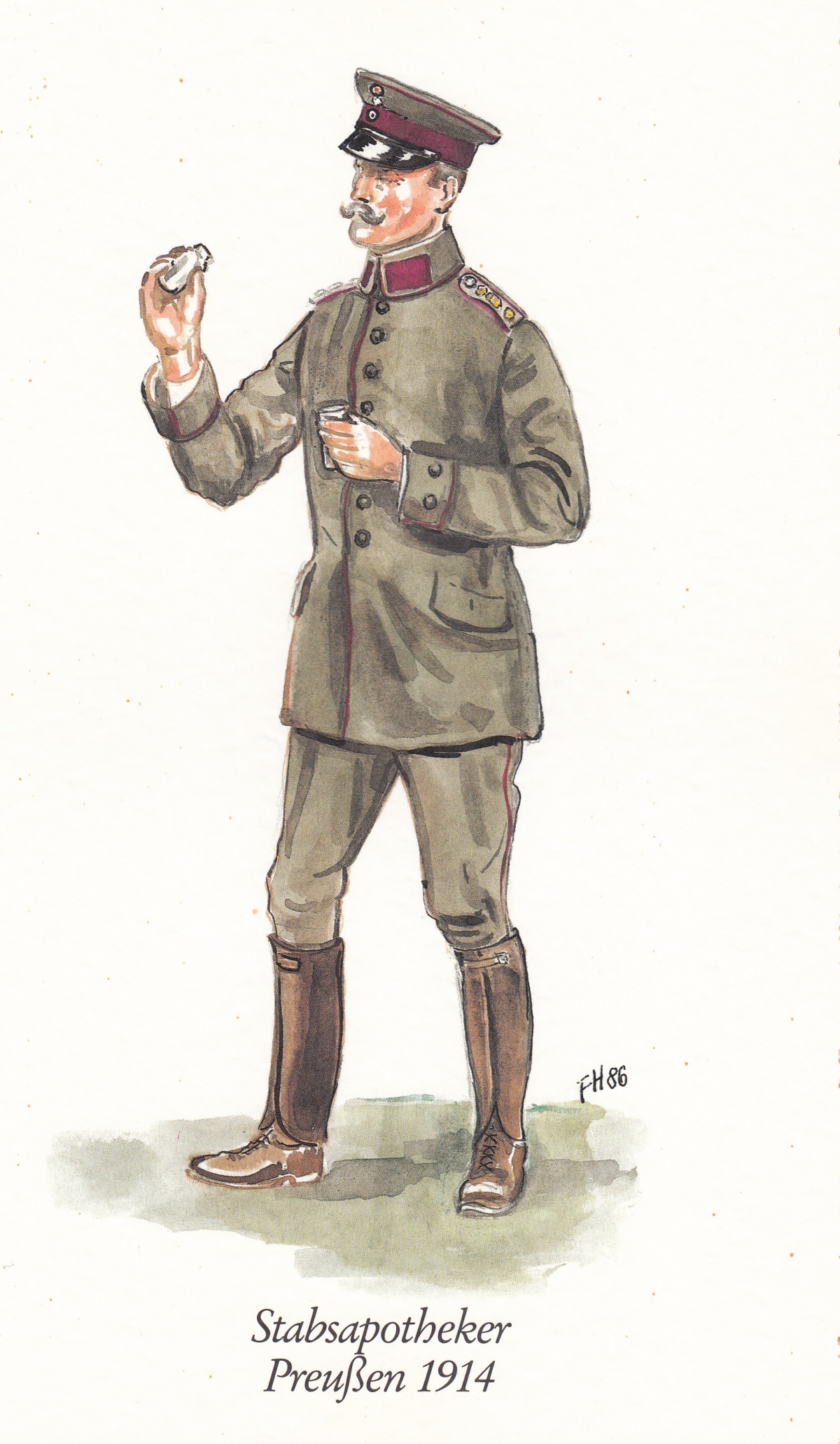 Im Ersten Weltkrieg dienten 2 033 Militärapotheker im Felde und 1 711 in der Heimat. Fünf Apotheker fielen, 61 weitere starben an Krankheiten [1, S. 14f.; 7, S. 1516]. Die Einsatzorte der Apotheker waren fast über den gesamten Kriegsschauplatz verteilt und verliefen von Frankreich im Westen bis östlich nach Russland, Rumänien sowie Vorderasien – neben den über-seeischen Besitzungen in Afrika und Asien. Die unter den kriegsgedienten Pharmazeuten den größten Anteil ausmachenden Oberapotheker waren keine etatmäßigen Militärangehörigen, sondern rekrutierten sich im Fall der Mobilmachung aus sogenannten Einjährig-Freiwilligen respektive Apothekern des Beurlaubtenstandes. Für Pharmazeuten bot sich nämlich beim Heer die Möglichkeit, statt einer einjährigen Militärdienstzeit am Stück mit der Waffe, den zweiten Teil des Wehrdienstes berufsbezogen abzuleisten. Diese Militärbeamten mit einem dem Leutnant vergleichbaren Dienstgrad – der Status des Offiziers für Apotheker war noch lange nicht in Sicht – kamen im Krieg der kämpfenden Truppe durchgehend am nächsten [4; 9; 10, S. 1571; 13; 14; 15; 16, S. 796; 21]. Die im Dienstgrad den Hauptleuten vergleichbaren Stabs- und Korpsstabsapotheker hatten als zumeist etatmäßige Militärapotheker ab 1902 ein Studium als Lebensmittelchemiker vorzuweisen. Die Korpsstabsapotheker waren den Stabsapothekern fachlich vor-, rangmäßig jedoch gleichgesetzt und den Standorten der Armeekorps zugeordnet [10, S. 1570f.]. Im Kriegsministerium besetzte im Frieden wie im Krieg ein Oberstabsapotheker den Spitzendienstposten in der deutschen Heerespharmazie [18].
