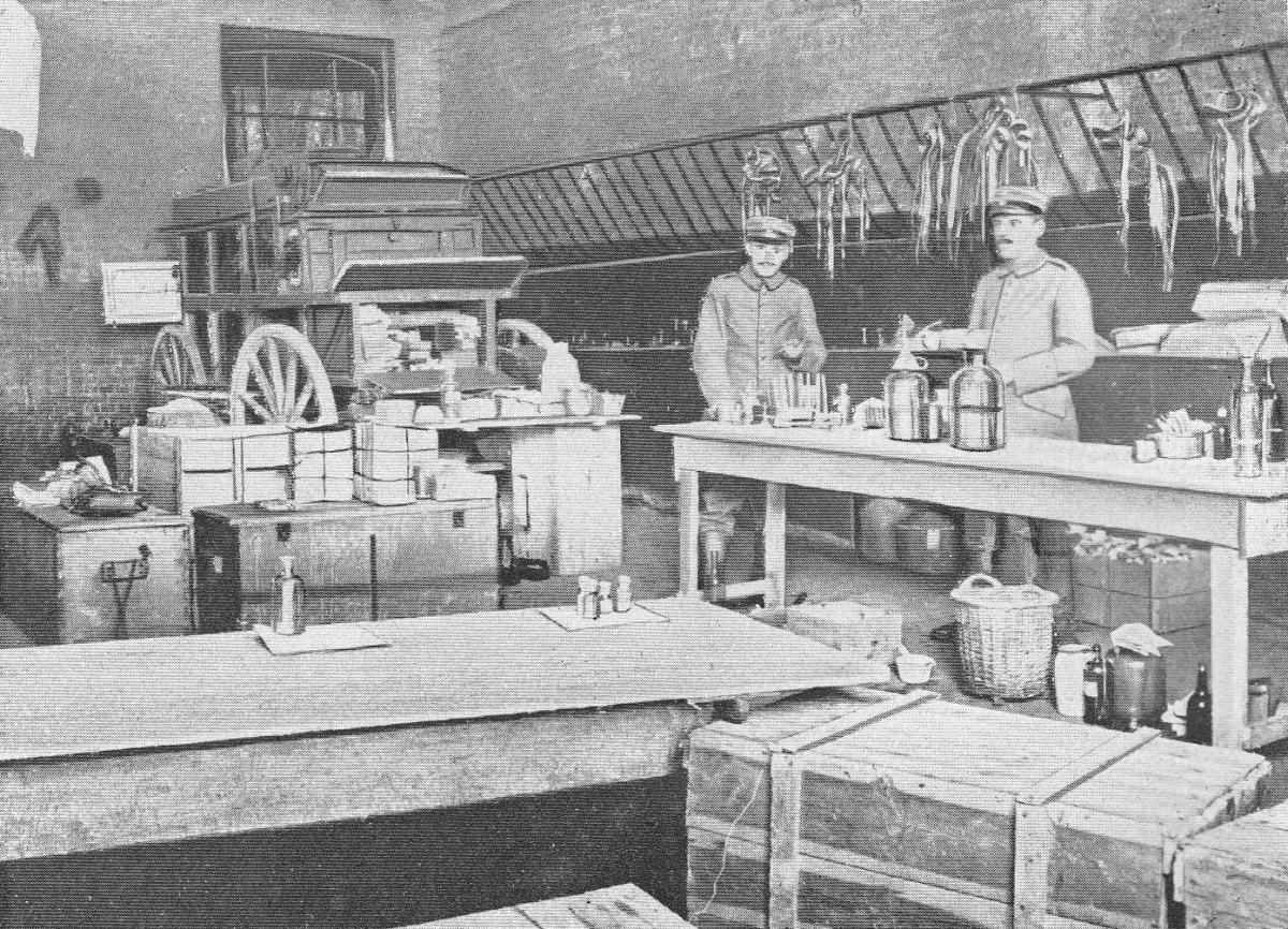 Wagonweise erfolgte für jedes Sanitätsdepot – diese Dienststellen waren bereits ab 1909 unter selbstständiger Leitung von Militärapothekern [12, S. 1572] – in den ersten Kriegswochen eine Anlieferung von zehntausenden Thermometern, hunderttausenden Spritzen, Schienen und allerlei weiterem Sanitätsmaterial [1, S. 99f.]. Die Sanitätsdepots, gewöhnlich in örtlicher Nähe der Stellvertretenden Generalkommandos aufgestellt, waren indes nicht nur logistische Einrichtungen; in diesen fand auch eine umfangreiche Herstellung von Sanitätsmaterial statt. Sie umfasste beispielsweise Tabletten, sterile Ampullen sowie Pflaster; eine eigene Verbandmittelabteilung produzierte Binden, Watte, Mull und Gipsbinden, die allesamt versandbereit hergerichtet wurden. Die ebenfalls von Stabsapothekern geleiteten heimatlichen Gütersammelstellen, aus denen das Sanitätsmaterial schließlich in die Etappensanitätsdepots verbracht wurde, kauften Waren freihändig ein oder bezogen sie zentral aus den Sanitätsdepots [18]. Die Apotheker in den Depots verbesserten im laufenden Betrieb ständig die Prozesse und ersannen beispielsweise Verfahren zur Massenabfüllung von Ampullen, über die zu Anfang des Krieges auch pharmazeutische Fachzeitschriften berichteten [17; 18].