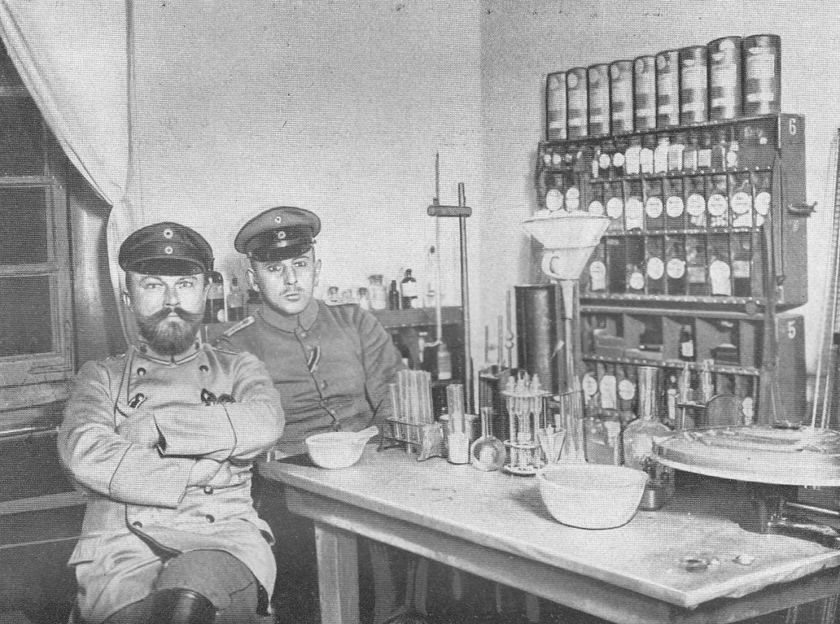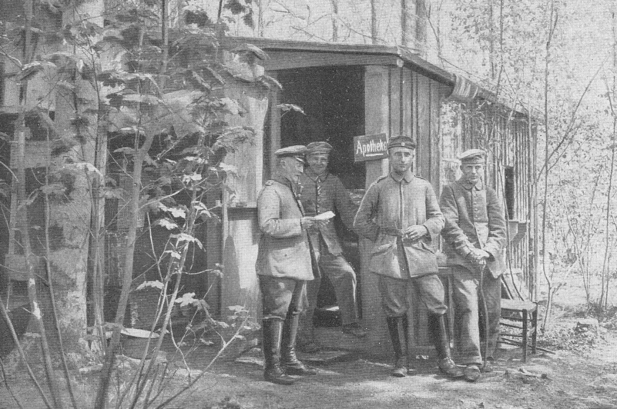 Nach der für die Organisation des Sanitätsdienstes maßgeblichen Vorschrift, der Kriegssanitätsordnung aus dem Jahr 1907, gehörte zu jedem Armeekorps ein Sanitätsbataillon, bestehend aus drei Sanitätskompanien und zwölf Feldlazaretten [4, S. 6]. Bei den Sanitätskompanien verwalteten Oberapotheker das für die Truppenverbandplätze, Hauptverbandplätze und Revierstuben bestimmte Sanitätsmaterial und stellten aus ihren Sanitäts-, vulgo Apothekenwagen, Ersatz für das weiter an der Front Verbrauchte. Darunter waren Äther, Chloroform, Morphin, Tetanusserum, des Weiteren auch Rizinusöl, Tannalbintabletten, Salicyltalg und Kresolpuder sowie ärztliche Instrumente. Auch führten sie vor Ort Wasseruntersuchungen bzw. laborchemische Untersuchungen auf ärztliche Anweisung durch. Während großer Kämpfe mit zahlreichen Verwundeten hatten sie am Hauptverbandplatz alle Hände voll zu tun: Verbandmaterial und Arzneimittel mussten verausgabt, Kochsalz- und Glucoselösung bereitet und sterilisiert sowie Nachschub aus den Depots, notfalls auch aus Feldlazaretten rechtzeitig organisiert werden. Einige Militärapotheker haben darüber hinaus auch bei Operationen assistiert, in den Kampfphasen setzte man sie gelegentlich sogar bei der Sichtung von Verwundeten ein [1, S. 261; 18].